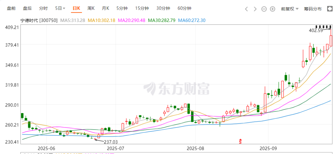 宁德时代(300750.SZ)近期重拾涨势,并创下了上市以来新高。