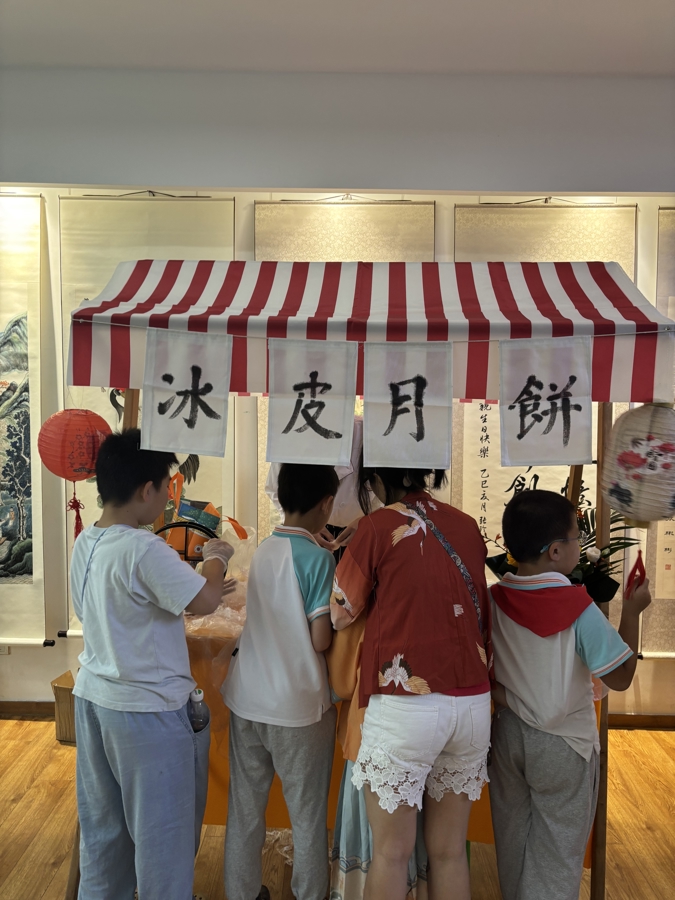 然后,只要拿着一张特制“游园集章卡”,就可以去不同的摊位打卡体验了。记者看到,这里的互动体验不仅有中秋节传统项目——猜灯谜、中秋月饼DIY工坊;有拿捏秋日氛围的桂香中秋插花体验、茶道体验、桂花粘土;也有“舌尖上的中秋”——桂花糖藕美食摊,大家争相品尝这道秋日美食,有的还动手体验制作的乐趣;而在书法团扇创造工坊,国潮与团扇的结合,潍坊书画社老师带着大家共创独一无二的书画作品。