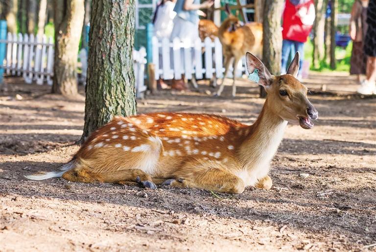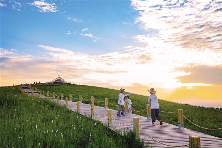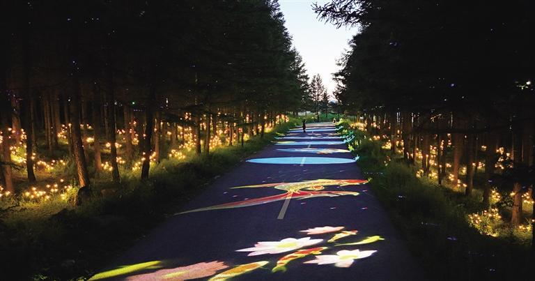 哈达门国家森林公园内,草甸向天边延展。夜幕降临,林间灯光闪烁,林荫路上光影流转,晚风拂面,漫步其间,惬意十足。
